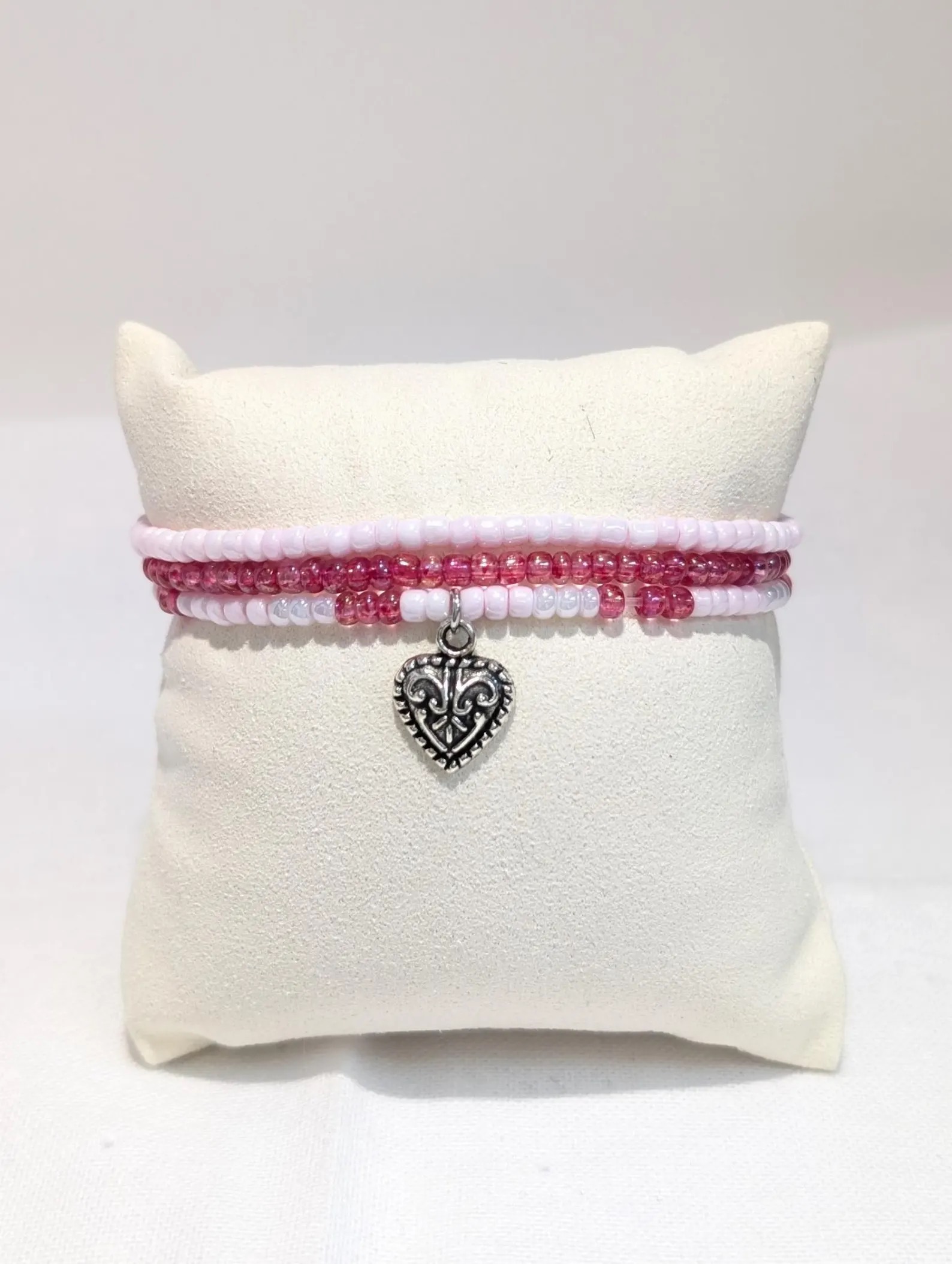 Craquez pour ce lot de 3 bracelets en perles roses, ornés d’un pendentif cœur argenté, entièrement faits main avec soin.